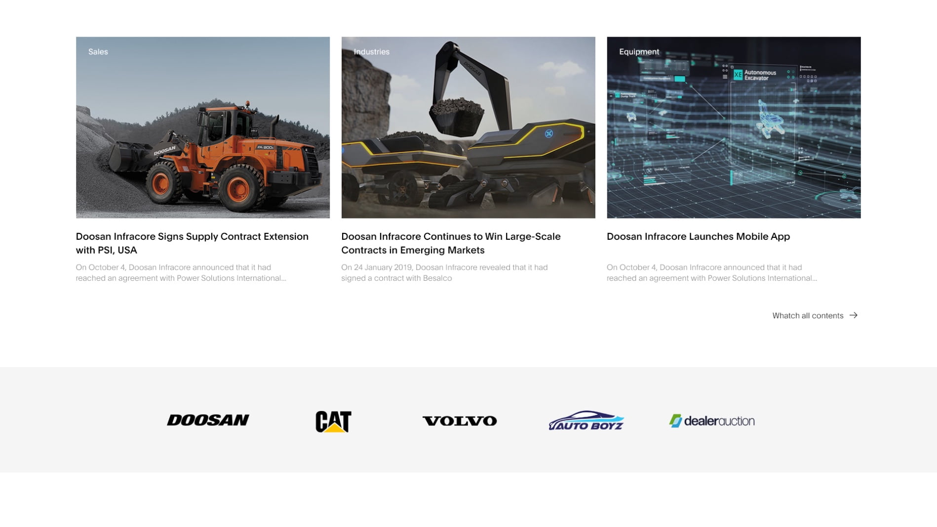 80여 년이 넘는 한국 최고의 건설기계 기업 두산인프라코어의 수많은 자료들을 디지털화여 아카이빙한 콘텐츠 페이지입니다. 각 시대별 변화의 모습을 5개의 시대로 나누어 혁신적으로 변화하는 두산인프라코어의 역사를 담아냈습니다.